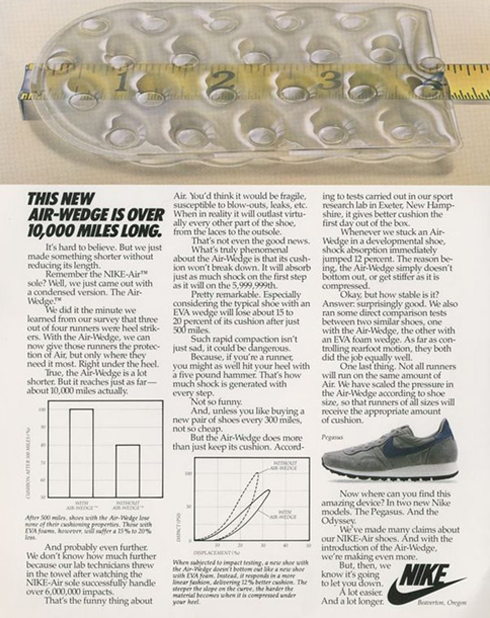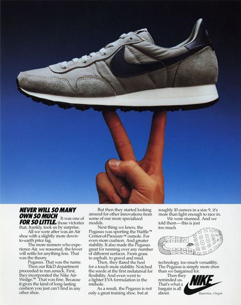 Když se Pegasus objevil na trhu v roce 1983, Nike chtěla zdůraznit dvě věci: odpružení Air-Wedge a cenovou dostupnost. Propagační materiály zdůrazňovaly výzkum značky v oblasti pevnosti a odolnosti podrážky Air a uváděly, že si zachovává své tlumící vlastnosti po uběhnutí více než 500 mil, zatímco laboranti údajně „hodili ručník do ringu“ poté, co pozorovali, že úspěšně odolala více než „6 000 000 nárazům“. Značka prohlásila: „Nikdy tolik lidí nebude vlastnit tolik za tak málo.“ – což byl odkaz na neuvěřitelnou technologii, kterou majitelé bot Pegasus získali za tak rozumnou cenu.